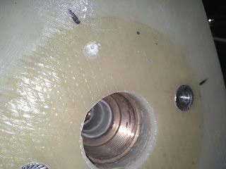 In most cases I used 1/2" G10 pultruded fiberglass, 1/2" thick but in the example shown here, the backing plate material never showed up in time so we laminated a few pre-made 1/4" thick glass and poly sheets together to make the basic backing plate. Below you see the plate with 3 of the stainless bolts and crown nuts already installed. This blog post shows the process used to install the the 4th and final nut and bolt. Here is the top with 1 bolt still needing to be installed.